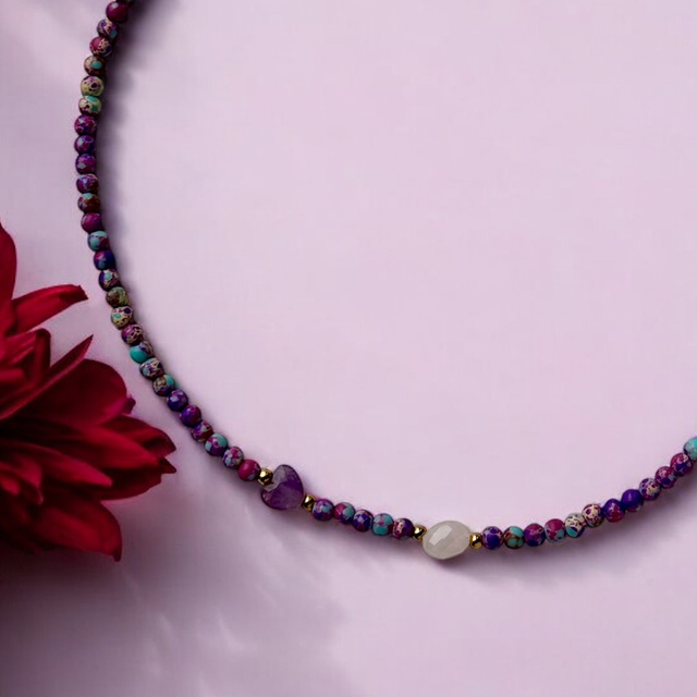 Walentynkowy naszyjnik wykonany z jaspisu cesarskiego, z serduszkiem z ametystu oraz fasetowanym kwarcem różowym. Delikatne połączenie kamieni symbolizujących miłość, harmonię i spokój emocjonalny.