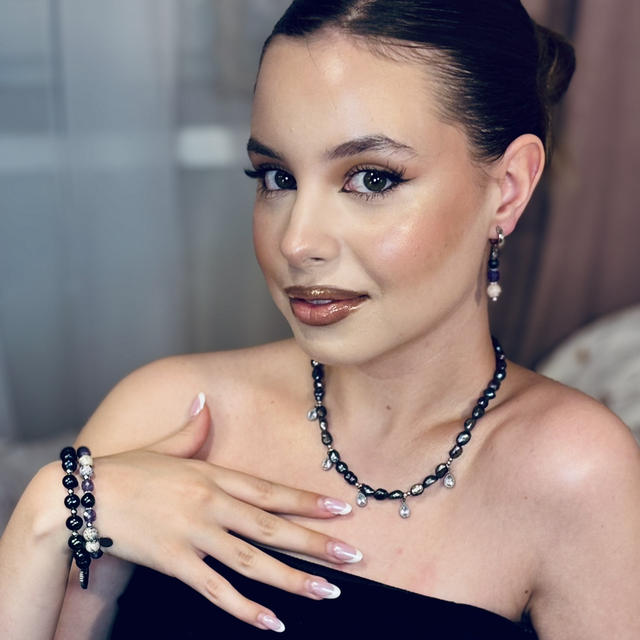 Bransoletka na gumce wykonana z granatowej perły, ametystu i jaspisu to połączenie elegancji i naturalnej energii kamieni. Elastyczna forma sprawia, że pięknie dopasowuje się do nadgarstka, a srebrne przekładki ze stali szlachetnej dodają jej subtelnego połysku. Kompozycja kolorów tworzy spokojny, magiczny klimat, dzięki czemu bransoletka sprawdzi się zarówno jako codzienny talizman, jak i efektowny dodatek do bardziej wyjątkowych stylizacji.