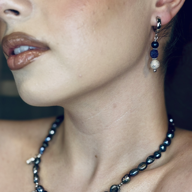Kolczyki w srebrnym wykończeniu ze stali szlachetnej łączą w sobie granatową perłę, ametyst i jaspis, tworząc eleganckie, harmonijne zestawienie barw inspirowane nocnym niebem. Głęboki odcień perły dodaje tajemniczości, ametyst wprowadza odrobinę magicznego blasku, a jaspis podkreśla naturalny, kamienny charakter biżuterii. Całość jest lekka, stylowa i idealnie sprawdzi się zarówno na co dzień, jak i przy bardziej wyjątkowych okazjach.
