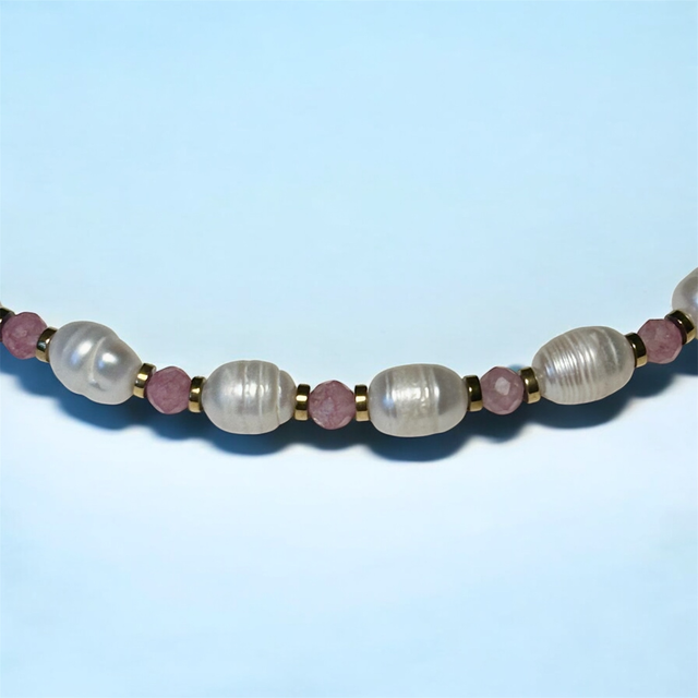 Naszyjnik z białych pereł hodowlanych i różowego turmalinu to połączenie subtelności i delikatnej energii kamieni. Perły wprowadzają klasyczny, elegancki blask, a różowy turmalin dodaje całości dziewczęcego uroku i nuty romantycznej magii. Kompozycja jest lekka, harmonijna i wyjątkowo efektowna, idealna dla osób, które lubią biżuterię z odrobiną koloru, ale wciąż utrzymaną w eleganckim stylu.